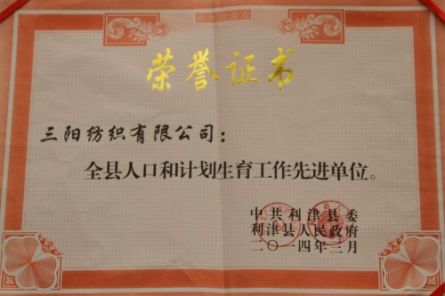 3月24日,全县2013年度人口和计划生育目标责任奖惩兑现暨工作会议在利津县宾馆迎宾楼第一会议室举行。我公司荣获全县人口和计划生育工作先进单位。